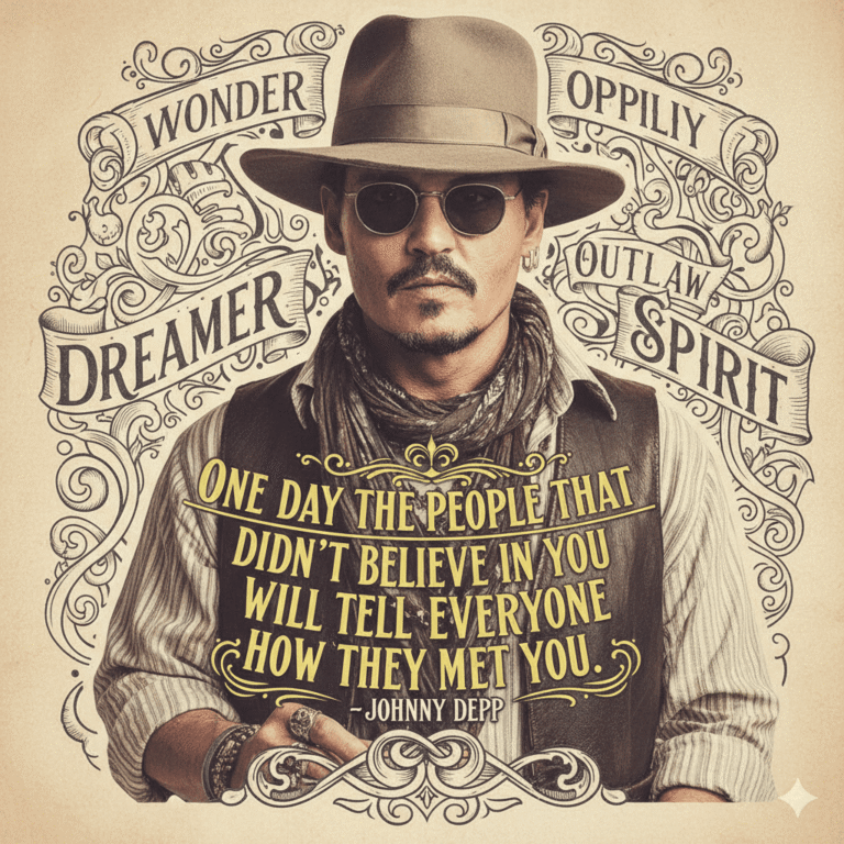 A captivating photograph of Johnny Depp, showcasing his iconic style with a wide-brimmed hat shading his face and sunglasses concealing his eyes. He gazes intently into the camera, exuding both charisma and mystery. The background is a playful, typographic design featuring an eye-catching quote in a yellow font attributed to Depp: «One day the people that didn’t believe in you will tell everyone how they met you.» The vintage-inspired typography adds to the nostalgic and witty mood of the image, creating an overall charm that evokes a sense of timelessness, photo, typography