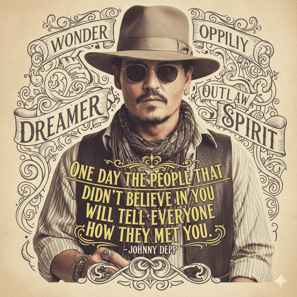 A captivating photograph of Johnny Depp, showcasing his iconic style with a wide-brimmed hat shading his face and sunglasses concealing his eyes. He gazes intently into the camera, exuding both charisma and mystery. The background is a playful, typographic design featuring an eye-catching quote in a yellow font attributed to Depp: «One day the people […]