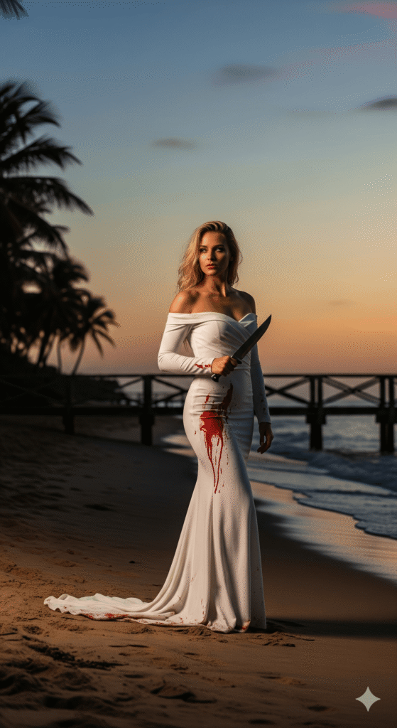9:16 A stunning blonde woman in a form-fitting, off-the-shoulder white gown with blood stains, stands gracefully on a sandy beach, with palm trees and a wooden railing in the background. The serene evening sky adds a romantic touch to this elegant scene. she hold a knife on her hand