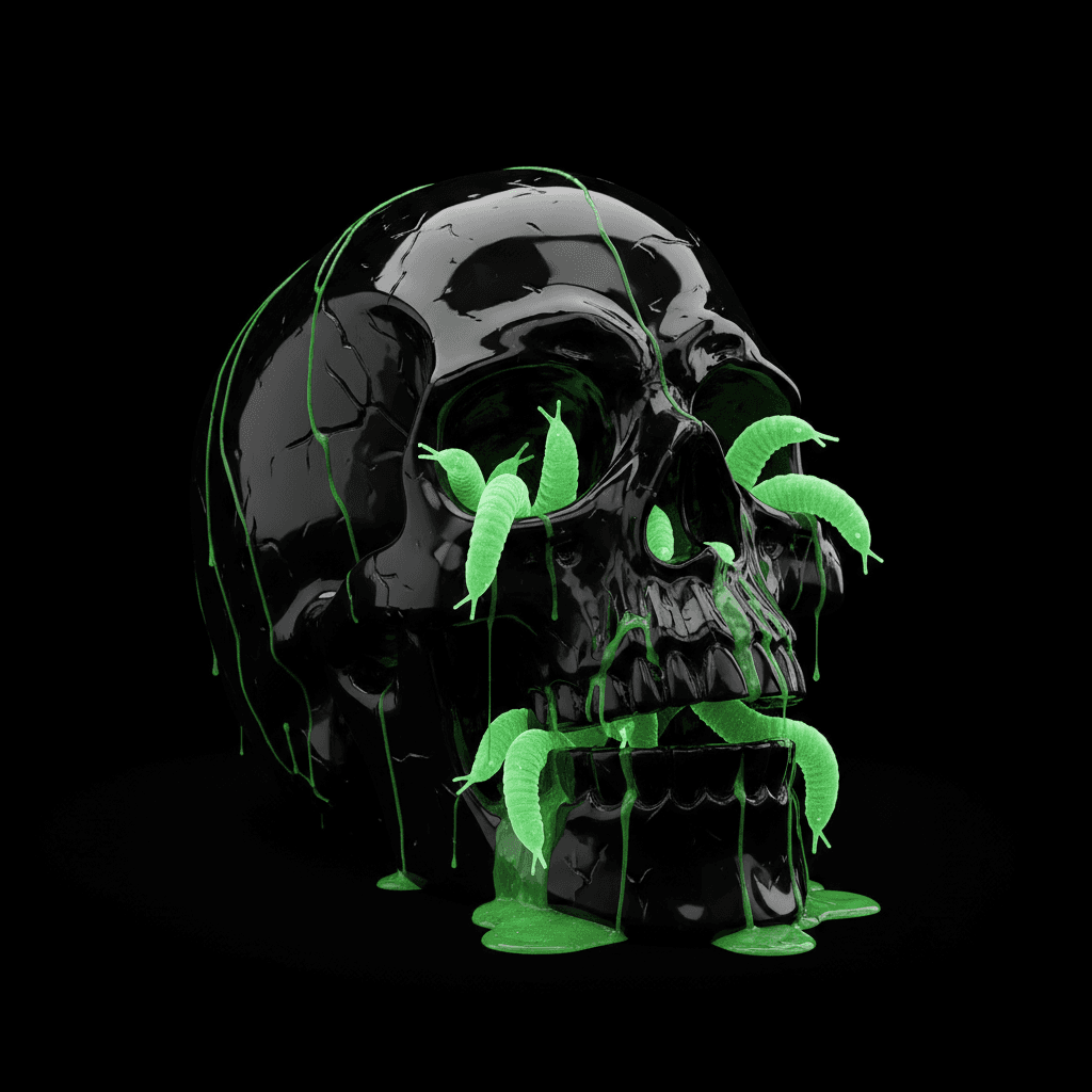 A terrifying skull made of black obsidian. Glowing green slugs are crawling out of its eyes and mouth, leaving a trail of luminous slime. Dark background, hyperrealistic, 4k