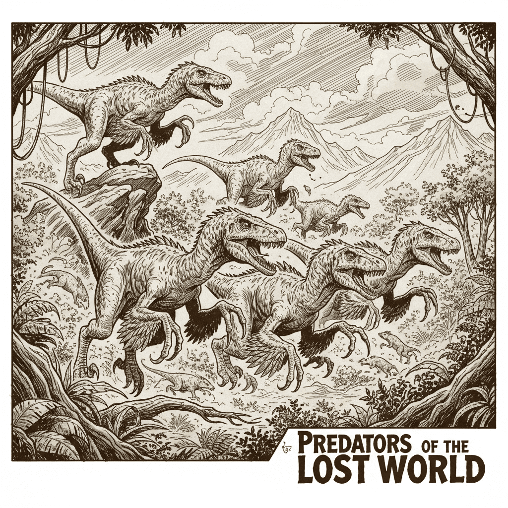 7 Austroraptor Ink illustration with monochromatic sepia tones, comic book style, likely modern era (late 20th century to 21st century), expansive use of hatching and cross-hatching for texture, and dynamic shading for depth and form.