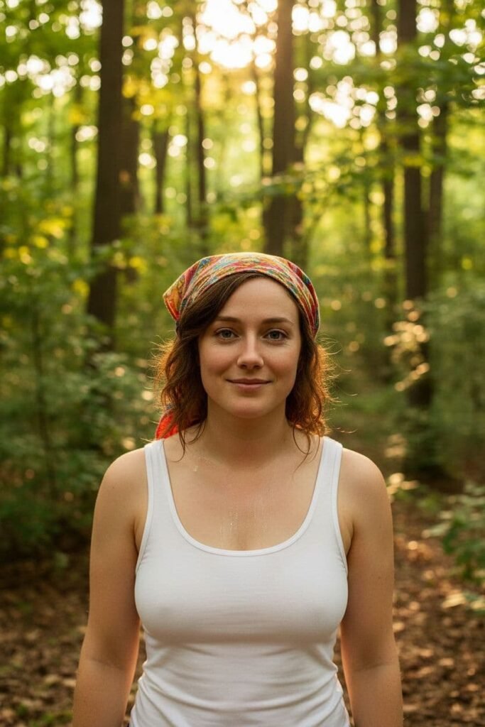 The uploaded woman stands out against a backdrop of dense trees and shrubbery, the warm sunlight filtering through the leaves creating dappled shadows on the forest floor. She wears a colorful headscarf tied loosely around her head. A white tank top clings to her body, covered in sweat as she stands in the midst of […]